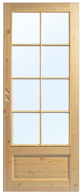 Allmogeskjutdörr i massiv furu med stort glasparti.